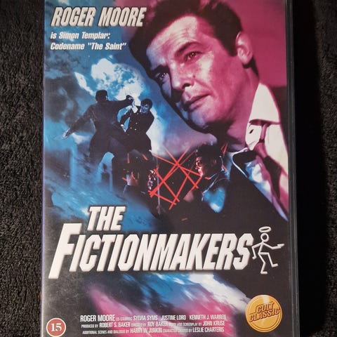 The Fictionmakers dvd. Film med Roger Moore. Omslaget viser, at udgivelsen er en dvd med aldersmærkning 15 år. Velegnet til afspilning på standard dvd‑afspillere, der understøtter det angivne regionsformat og sprog-/undertekstmuligheder som vist på bagsiden af coveret.