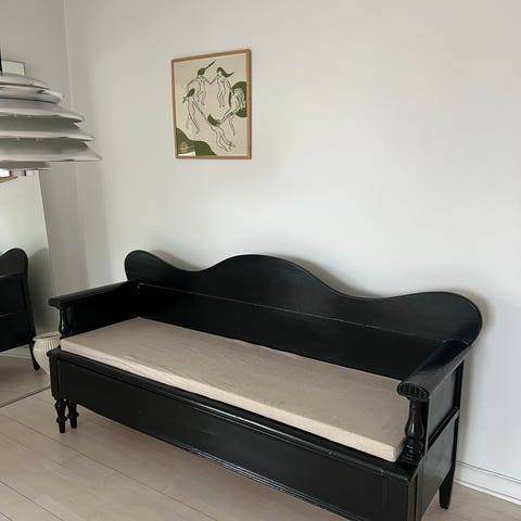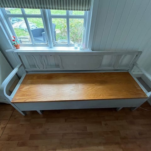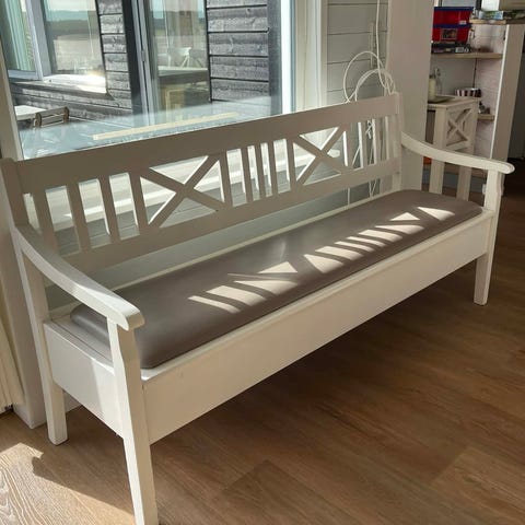 Hvidmalet bænk / slagbænk / svensk slagbænk / bænk med opbevaringsplads under sædet.