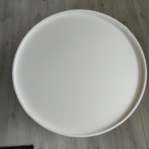 Træ og hvidt bord, diameter 45cm og højde 50cm.