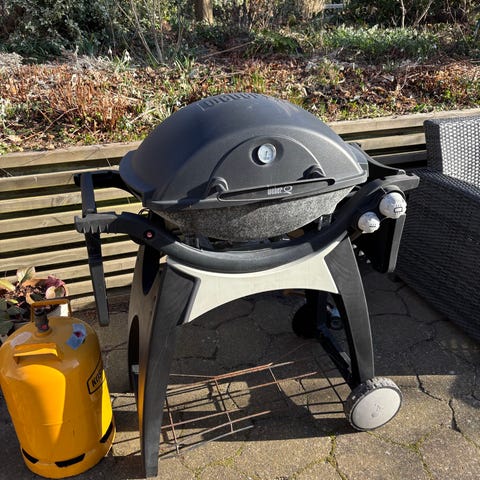 Weber Q gasgrill i sort. Kompakt model med låg og grillrist i støbejern. Grillen har integrerede håndtag i plast og betjeningsknap på fronten. Egnet til udendørs brug på altan, terrasse eller i have. Tilsluttes gasflaske via regulator og slange (ikke synlig på billederne).