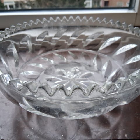 Smuk, gammel, slebet krystalskål med bølget kant fra Sverige.