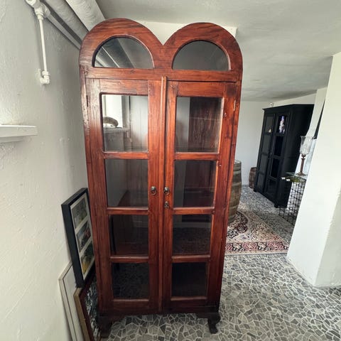 Sort bejdset vitrineskab med dobbelt glaslåger. Lås virker perfekt.