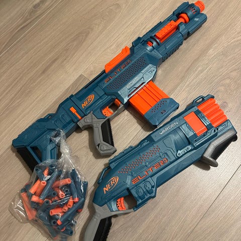 Nerf legetøjsgevær i blå og orange plast. Sættet omfatter et langt gevær og en automatisk pistol og aftagelige magasiner i orange. Egnet som skumdart-legetøj til børn, til leg både inde og ude.