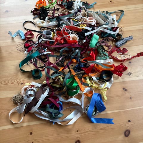 Blandet parti bånd og blonder til syning og hobby i forskellige farver og bredder. Pakken indeholder blandt andet elastikbånd, pyntebånd, blondebånd, pomponbånd og vævede bånd i både neutrale og stærke farver. Der ses både ensfarvede og mønstrede bånd, herunder blomstrede og geometriske mønstre. Materialerne fremstår som tekstilbånd velegnet til brug i fx tøjreparation, dekoration, patchwork, tasker, puder og andre kreative projekter. Båndene ligger i ruller og bundter med varierende længder og bredder.
