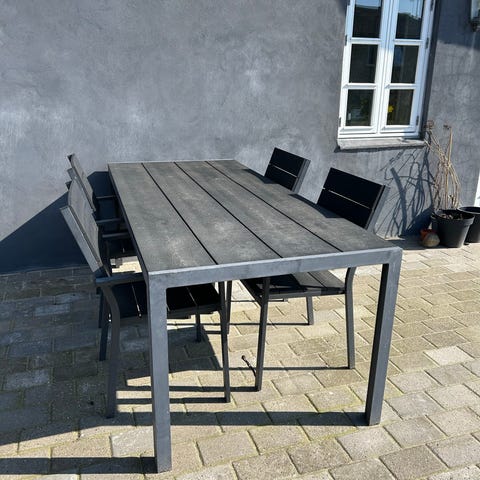 Havebord i rektangulær form med bordplade i lameller med trælook og stel i metal. Bordet egner sig til udendørs brug på terrasse, altan eller i haven og har plads til flere personer omkring bordet. Overfladen består af smalle, parallelle lameller, som giver et enkelt og funktionelt udtryk. b. 90 cm. l. 150 cm. h. 73 cm. Velegnet sammen med forskellige typer havestole eller bænke.
