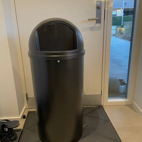 Wesco Pushboy affaldsspand i rød lakeret metal med kromfarvet push-låg. H 75 cm . Cylindrisk model med kuppelformet top og svinglåg mærket med Wesco-logo og teksten "PUSH". Egnet til indendørs brug i køkken, kontor eller fællesrum, hvor der er behov for en fritstående affaldsløsning.