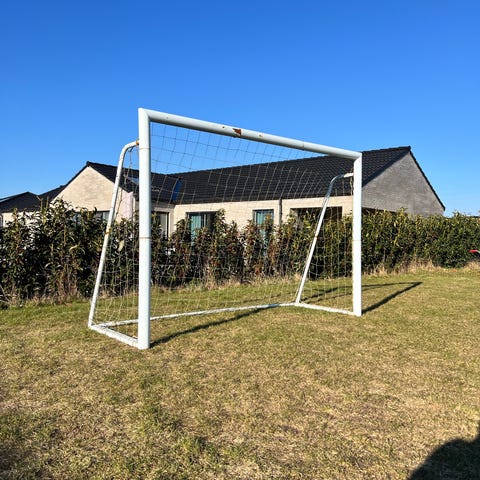 Fodboldmål i metal i grå farve. Målet har net monteret på rammen og er egnet til brug i have eller på mindre udendørs arealer til leg og træning. Konstruktionen består af rør, der er samlet med samlinger i hjørnerne. Velegnet til børn og unge til almindelig fritidsspil.