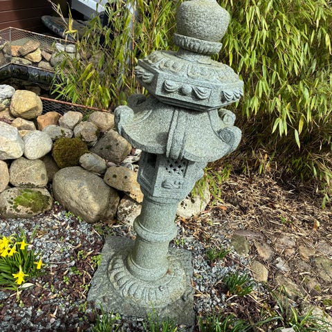 Abstrakt skulptur til udendørs brug udført i sten og metal. Skulpturen står på en rund stenfod, hvorfra et buet stenelement er monteret omkring en lodret metalstang. Overfladen fremstår rå og naturpræget, egnet til placering i have, indkørsel eller på terrasse som dekorativ udsmykning.