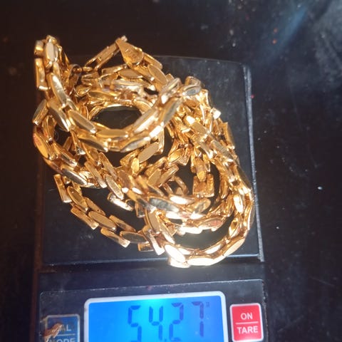Kæden har små led og et centralt vedhæng formet som en blomst. 28 cm lang 14 karat guld og vægt 2g