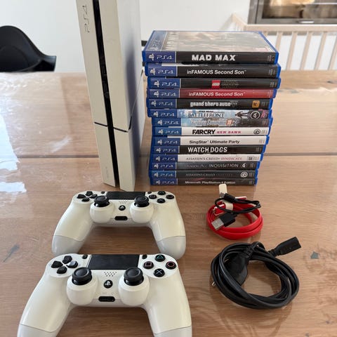 Første mand til mølle. Sony Playstation 4 konsol i sort/hvid farvekombination. Medfølgende fire trådløse DualShock 4 controllere i sort. Konsollen er egnet til spil, streaming og multimediebrug og kan tilsluttes tv via HDMI. Systemet understøtter både fysiske spil på disk og digitale spil via online-tjenester, afhængigt af brugerens egne abonnementer og spilbibliotek. Fifa 20-21-22 fås med.