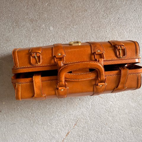 Lukning med lynlås og messingbeslag i god stand.