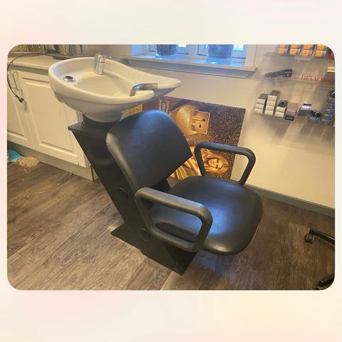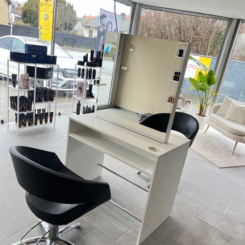 Frisør arbejdsplads med stort vægspejl og frisørstol. Arbejdspladsen omfatter en sort hylde/arbejdsbord under spejlet til opbevaring af redskaber samt en frisørstol med armlæn. Velegnet til indretning af frisørsalon eller hjemmebehandling, hvor der er behov for spejl og siddende kundeplads.