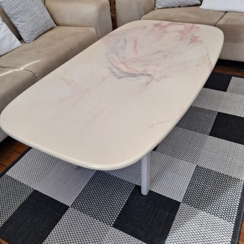 Fremstår perfekt. Virker større end målene lyder, da jeg har haft en stor sofagruppe til bordet - derimod har det været perfekt i højde og god i str. så det ikke tager for meget plads samtidig. Fremstår i Marmor look uden at være overdrevet eller se meget fake ud.