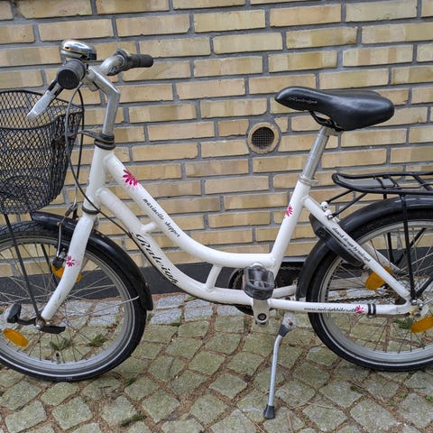 Raleigh Minishopper, børnecykel i hvid farve med 20" hjul, 3 gear og 1 håndbremse . Cyklen har lav indstigning, kurv foran og bagagebærer bagpå. Udstyret med drejegreb på styret og standard sadel og pedaler. Velegnet som hverdagscykel til børn i den størrelse, der passer til 20" hjul. Tydlige brugsspor og en del synlige rustspor, særligt på styr og kurv. Har stået i et skur et par år og trænger til rengøring og evt . smørelse