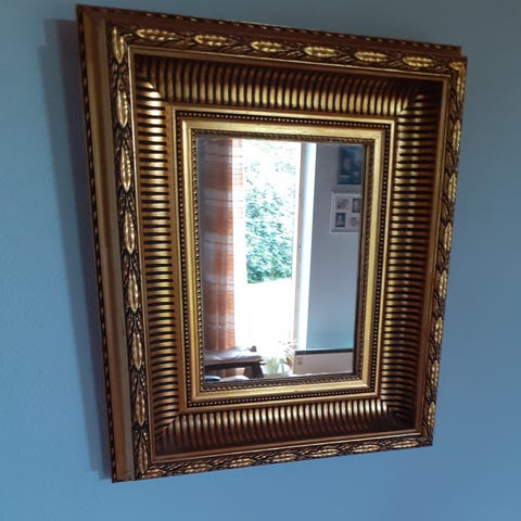 Spejl 34x13 cm, Guld/grå patineret, Fransk LANDSTIL, nips, patina, nyt og gammelt.
