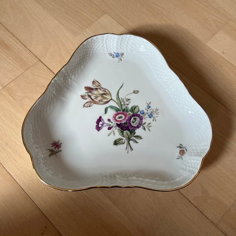 Porcelænsfad i bladform med håndtag. Fadet er dekoreret med flerfarvet blomstermotiv på glaseret hvid bund. Undersiden har Royal Copenhagen stempel og modelnummer 1826. Velegnet som serveringsfad eller dekorationsfad i køkken eller spisestue.