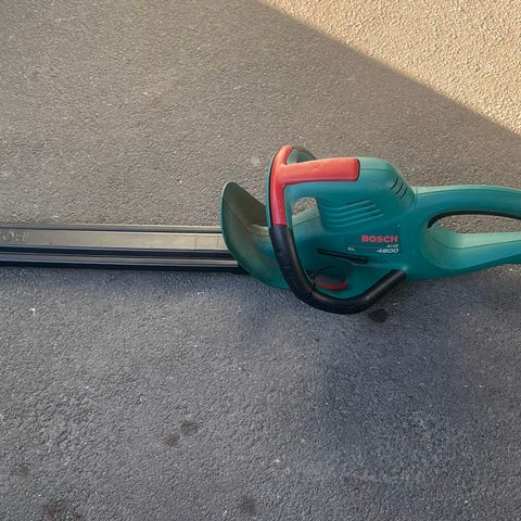 Bosch AHS 4800-ST hækkeklipper. Elektrisk hækkeklipper med sværdlængde på ca. 48 cm. Modellen har tohåndsgreb og beskyttelsesskede til klingen. Velegnet til trimning og klipning af hække og buske i haven.