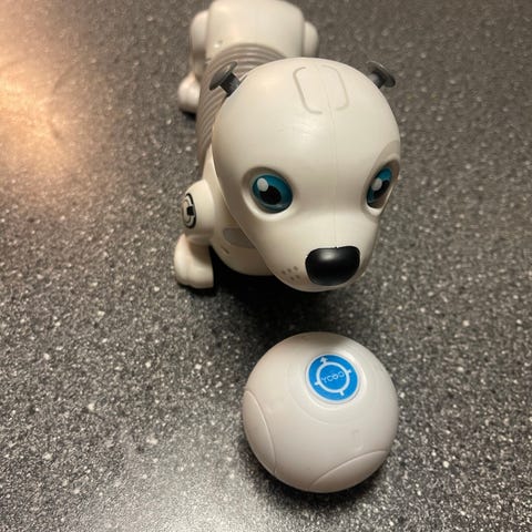 Super sjov elektrisk hund med lyd og bevægelse. De små elsker at kravle rundt efter den.