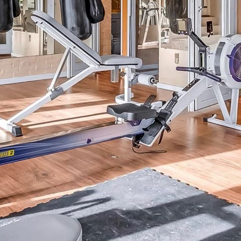 Romaskine med vandmodstand og computer (viser distance, tid, kalorier og tempo).