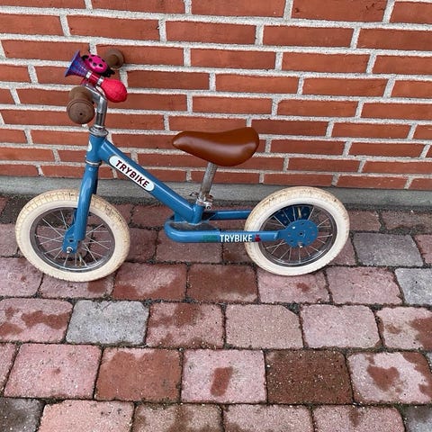 Trybike løbecykel med 12" hjul i hvid. Cyklen har stel i metal, hvide dæk, brune håndtag og brunt saddel. Egnet som løbecykel til mindre børn, der skal øve balance og styreteknik. Simpelt design uden pedaler, kæde eller støttehjul. Baghjulet taber luft, det skal nok enten skiftes eller lappes.