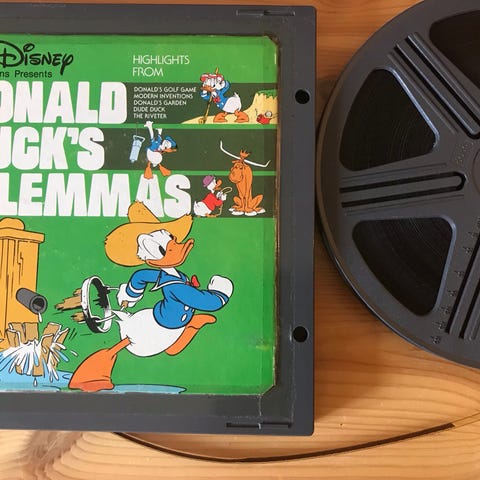 Walt Disney Donald Duck’s Dilemmas filmrulle på 8mm. Filmrullen leveres i plastkassette med farveomslag på forsiden. Omslaget angiver, at filmen indeholder udvalgte højdepunkter med Anders And, Mickey Mouse, Fedtmule og Pluto fra forskellige tegnefilm. Velegnet til 8mm filmfremviser, hvor denne type filmrulle kan afspilles. Blandede små tegnefilm. Klippet sammen på en 180 m. spole! Farver og lyd! Filmen er i Super 8 mm.