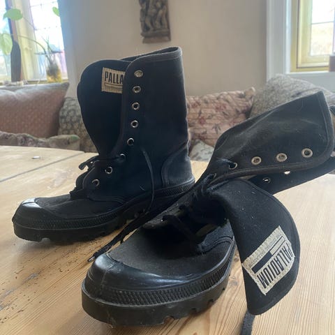 Palladium støvler i nubuck læder, str. 39, i en fin lys nuance a la lys nougat. De har aldrig været brugt, står derfor som helt nye.