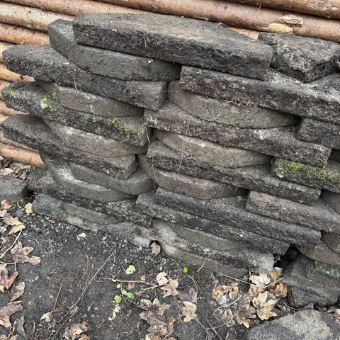Grå betonfliser og kantsten. Fliserne og stenene fremstår som standard udendørs belægningssten i beton, egnet til fx terrasse, gangarealer, indkørsel eller som kantafgrænsning i haveanlæg. Velegnet til udendørs brug, hvor der ønskes en robust og slidstærk belægning i grå beton. Der er ca. 145stk