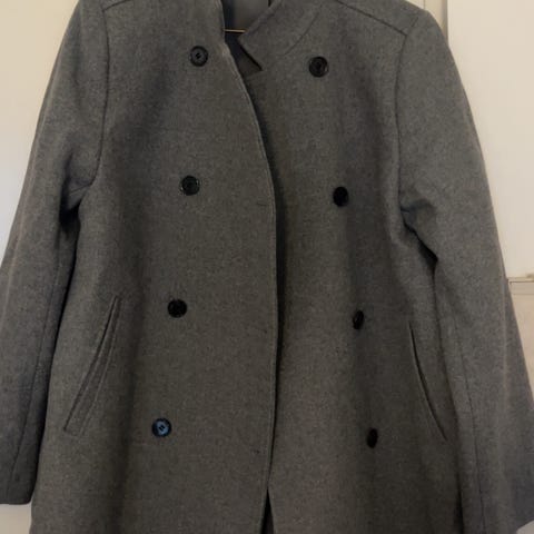 H&M jakke til damer i str. S. Jakken er blå og fremstillet i polyester. Den har klassisk skjortekrave, gennemgående knaplukning foran og store påsyede brystlommer med klap. Ærmerne afsluttes med manchetter med knapper. Materialet fremstår blødt og let struktureret, egnet som overgangsjakke eller let yderjakke i hverdagen.