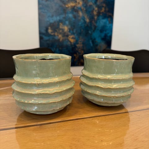 Smukke Ib Laursen urtepotter m. Underskåle, beige. 2 stk. Højde ca 16 cm incl underskål. Flot stand, ingen revner eller defekter. Samlet pris