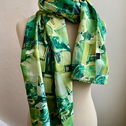Fantastisk tørklæde med rosemotiver i klare pink/rosa nuancer af mærket QD Denmark. Det er kraftigt, 100% polyester og krøller ikke. Meget klare farver - jeg har også et i grønne nuancer.