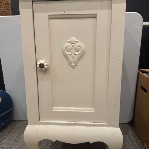 Lille pænt antikt skab i maghoni med låge og skuffe, og en marmor topplade. 2 stk. haves. H 78 x B 39 x D 39 cm
