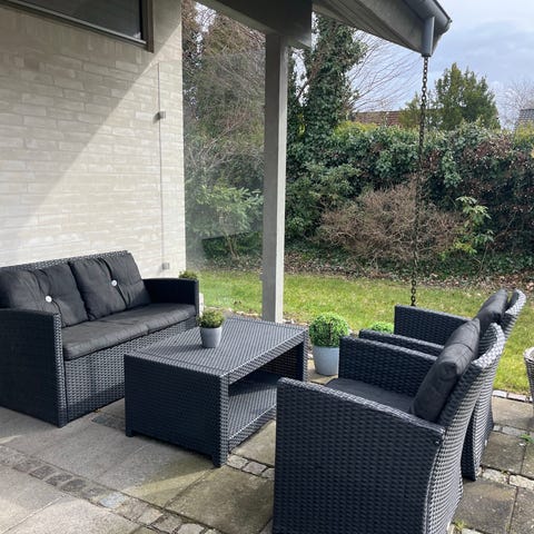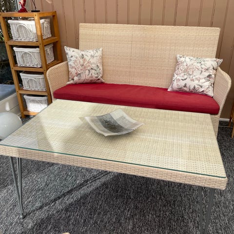Rattan loungesæt bestående af 2-personers sofa, to lænestole og rektangulært sofabord med glasplade. Sættet er udført i naturfarvet rattan med sorte ben. Sofaen har løs quiltet pude/overmadras og pyntepuder, og lænestolene har grå sæde- og rygpuder. Sofabordet har flettet rattanunderstel og klar glasplade. Egnet til fx udestue, overdækket terrasse eller stue. 2 år gammel i fin stand. Sælges på grund af flytning.