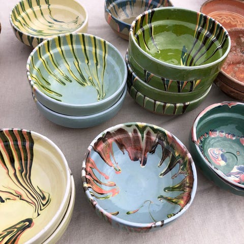 Ler skåle overvejende i naturfarvede nuancer. Skålene er hånddekorerede med forskellige mønstre og glasurer, blandt andet striber, blomster og abstrakte dekorationer. dekorative i en boligindretning. Gamle. Pris. 65.- pr. Stk. Skarp Fast pris.