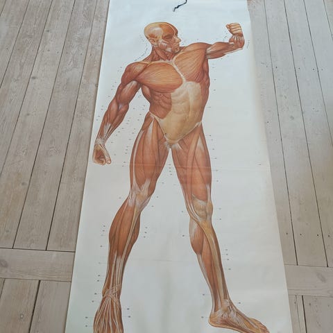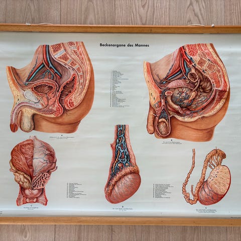 Flot gammel skoleplakat fra 1956 med motiv af kvindens bækkenorganer. Har hængt i klasselokale og er en klassisk undervisningsplakat i papir med originale træstænger i top og bund.