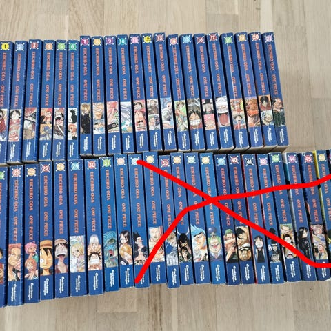 Samling af flere bind af manga-serien One Piece, illustreret og i lommebogsformat. Japansk tegneserie i sort/hvid med farvede omslag. Velegnet til læsere af shonen-manga og samlere af One Piece-serien.