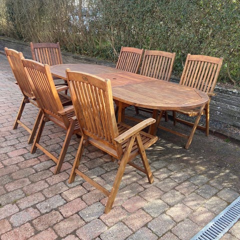 Teak havemøbelsæt Ø150 med 6 stole – udgået farve 🧡