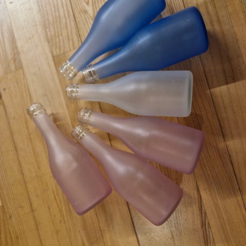 6 Stk. glas flasker perfekt til en enkelt blomst sælges for 10,00 kr. pr. stk. De er 24 cm høje og har en diameter på 5,3 cm.