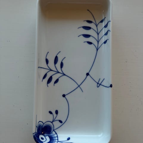 Dette smukke, rektangulære fad på 36 cm i Blå Mega Riflet skaber elegante serveringer af tapas og andre små retter. De håndmalede palmetter mødes af en smuk blomst, der gavmildt draperer sine kronblade ud over fadets kant og giver et anderledes udtryk. Lad fadet være centrum i en personlig borddækning, hvor du kombinerer dele fra forskellige Royal Copenhagen stel. Blå Mega Riflet er på en gang velkendt og forfriskende. Stellet er født af en modig nyfortolkning af det ikoniske Musselmalet Riflet og fortryller med sine grafiske og forstørrede sektioner af det musselmalede mønster. Siden Blå Mega Riflet blev designet i 2000 er stellet vokset sig til en ny klassiker inden for dansk design, og det iøjnefaldende stel er smukt i sig selv og i kombination med andre Royal Copenhagen stel.