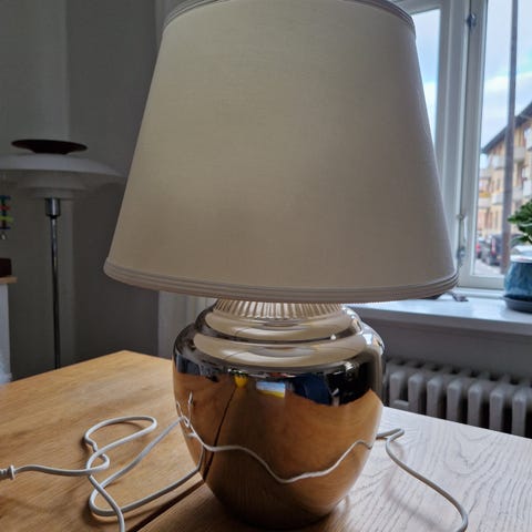 Flot sølv / stål bordlampe med sort skærm. Skærmen kan ændres, hvis man ønsker det