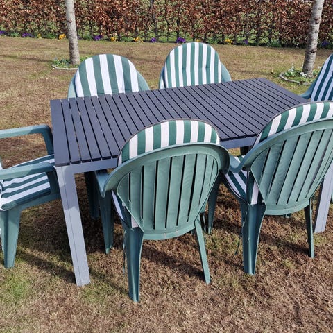 Bordet har altid haft dug på, så er særdeles pæn stand - stolene har brugsspor - hynder medfølger.