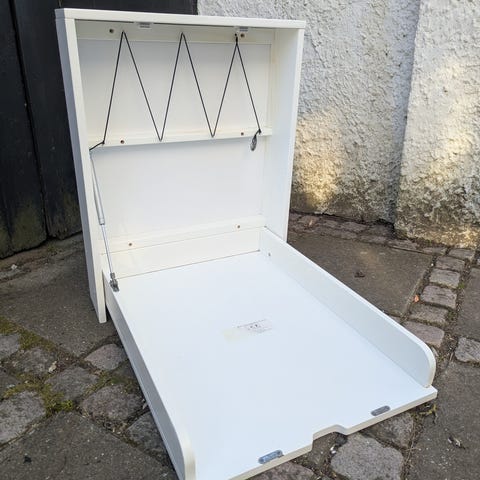 IKEA væghængt puslebord i hvid. Puslebordet kan klappes op mod væggen, så det fylder minimalt, når det ikke er i brug. Indvendigt er der hylder og rum til opbevaring af bleer, vådservietter og andre pusleting. Velegnet til børneværelse eller badeværelse, hvor der ønskes en pladsbesparende pusleløsning.