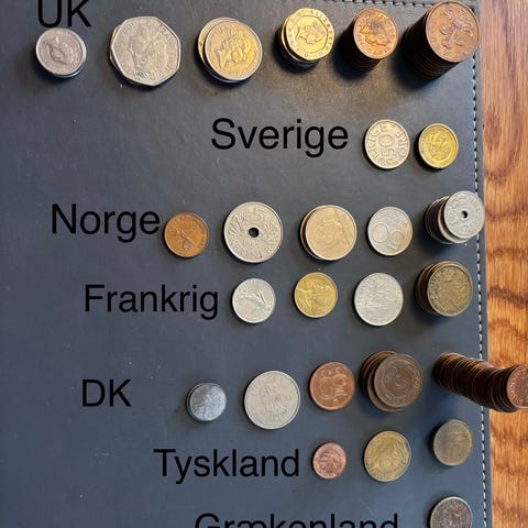 Møntsamling med blandede mønter i forskellige størrelser og udformninger. Mønterne fremstår i både sølvfarvet og guldfarvet metal. Motiverne omfatter portrætter og tekst langs kanten. Egnet til samlere af mønter eller som dekorative objekter. Antal, oprindelsesland, årstal og pålydende værdi fremgår ikke tydeligt af billederne og bør kontrolleres ved interesse.