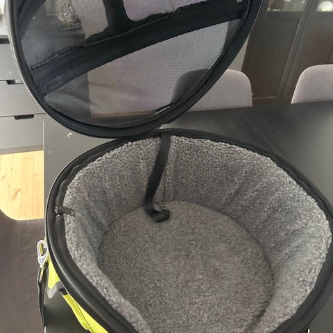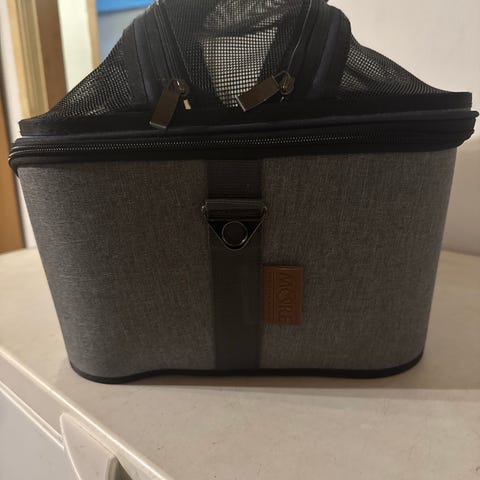 Transporttaske til kæledyr i grå med grøn kant. Tasken har netvinduer i siderne for ventilation og udsyn samt lynlåsåbning. Den er udstyret med bærehank og justerbar skulderrem, så den kan bæres i hånden eller over skulderen. Egnet til mindre kæledyr som f.eks. kat eller lille hund. Velegnet til transport i bil, på gåture eller korte rejser.