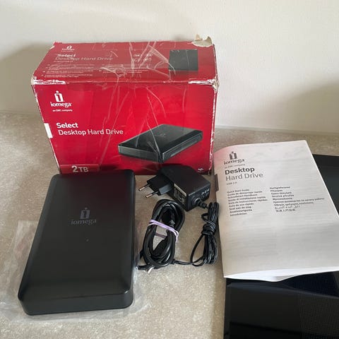 Iomega ekstern harddisk i sort. Enheden tilsluttes computer som ekstra lagringsenhed eller backup-løsning. Velegnet til opbevaring af filer som dokumenter, billeder, video og andre data. Modelbetegnelse og kapacitet er ikke oplyst.