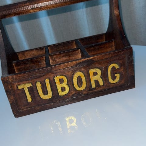 Tuborg ølkasse i træ i grøn farve. Kassen har trykt Tuborg øl-logo på siderne. Velegnet som opbevaringskasse eller dekoration. Klassisk trækonstruktion med åbne håndtag i enderne.
