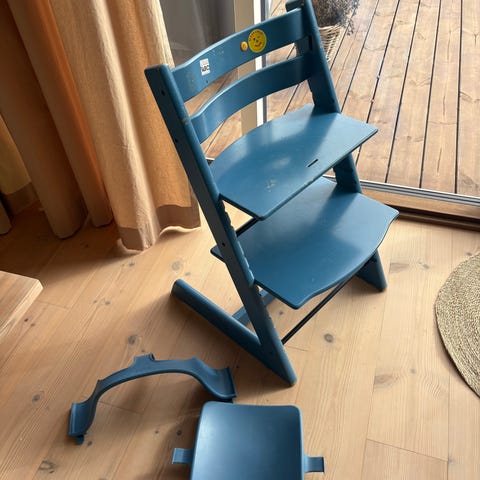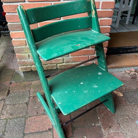 Stokke højstol i grøn. Klassisk træhøjstol med justerbar siddeplade og fodplade, som kan tilpasses barnets størrelse. Egnet til brug ved spisebord eller som siddeplads til børn i forskellige aldre. Bundsolid - kan sikkert overleve menneskets eksistens på jord..