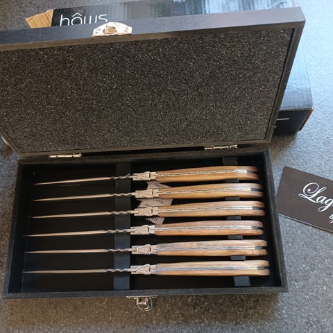Dette sæt består af 4 steakknive 21 cm lange. Hver kniv har et sort håndtag med to nitter og et skarpt blad, hvoraf tre er takkede og en er glat