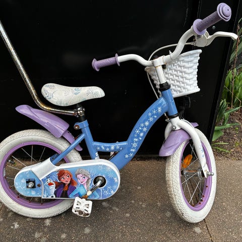 Disney Frozen børnecykel 12" i hvid, blå og lilla. Cyklen har kurv foran, støttehjul, kædeskærm og skærme over hjulene. Sadel og håndtag er farvekoordinerede med Frozen-motiver på stel og udstyr. Egnet som begynder- eller overgangscykel til mindre børn med 12" hjulstørrelse.