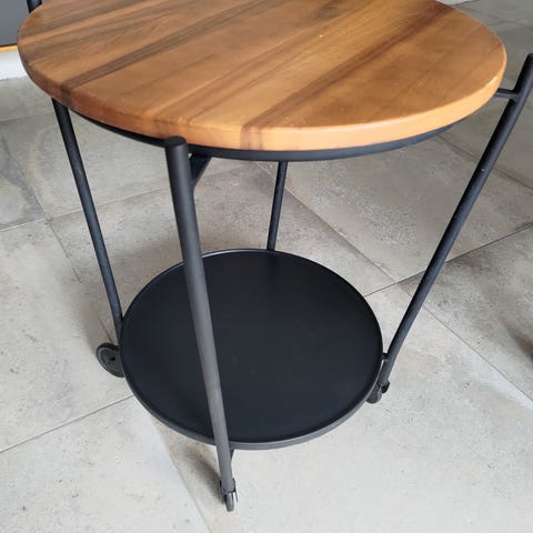 SACKit Serving Table med en Nordic Serving Tray er et bakkebord i sortlakeret stål kombineret med en rund serveringsbakke i mørkt træ. De to dele er designet til at passe præcist sammen, men fungerer også fint hver for sig.