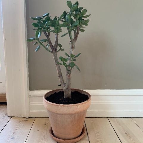 Crassula ovata stueplante i lerpotte. Planten er en sukkulent med tykke, grønne blade og flere forgrenede stammer. Den er plantet i en klassisk terracotta-lerpotte med underskål og jord. Velegnet som indendørs potteplante i stue eller andre lyse rum, hvor den kan stå i vindueskarm eller på gulv alt efter ønsket placering.